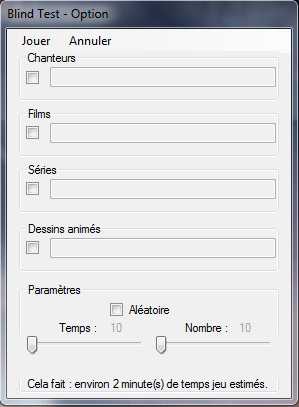 Pour jouer une partie, il vous faudra cliquer sur Fichier->Nouveau dans un premier temps afin de donner l'emplacement du/des dossier(s) qui contiennent les musiques puis paramétrer le temps, le nombre de musiques que vous souhaitez jouer dans une partie puis le mode aléatoire des lectures ou non.