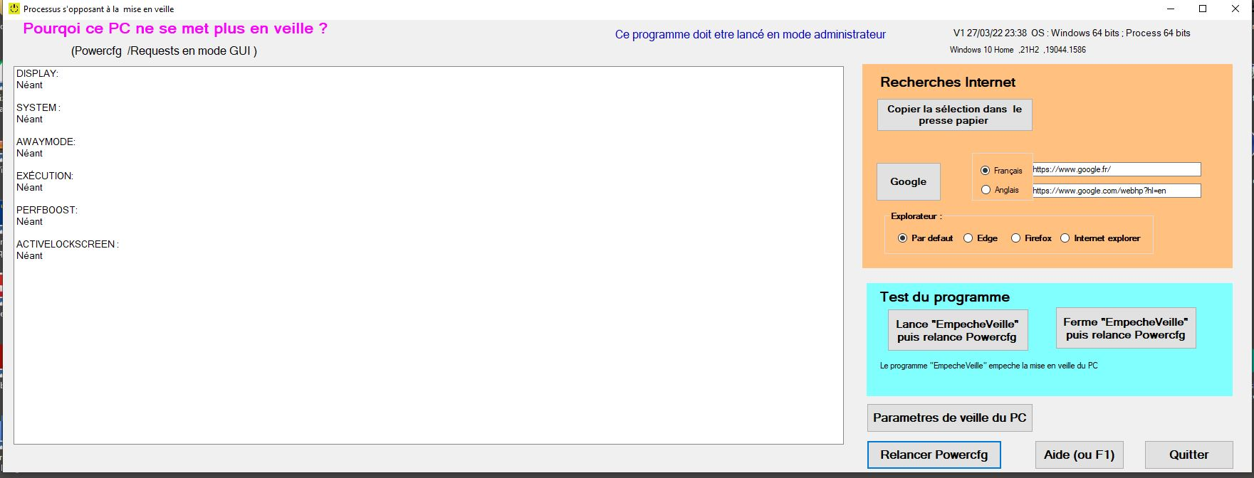 « PowercfgGui » est un logiciel en mode graphique qui permet de lister le(s) processus qui s’oppose(nt) à la mise en veille de Windows et donc d’aider à résoudre un problème de mise en veille.